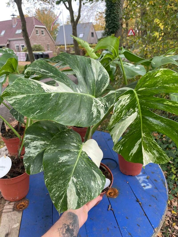 Met haar grote, glanzende bladeren en opvallende witte tot crème variegatie brengt ze direct karakter en elegantie in je interieur.