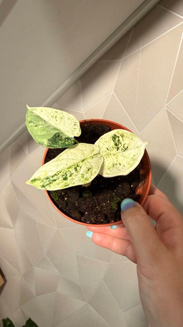 De Alocasia Dragon Scale mint is een betoverende variant van de geliefde Dragon Scale. Zijn donkergroene, glanzende bladeren met een uitgesproken nervenpatroon worden verrijkt door opvallende wit- tot geelgroene variegatie, waardoor hij nog mystieker oogt.