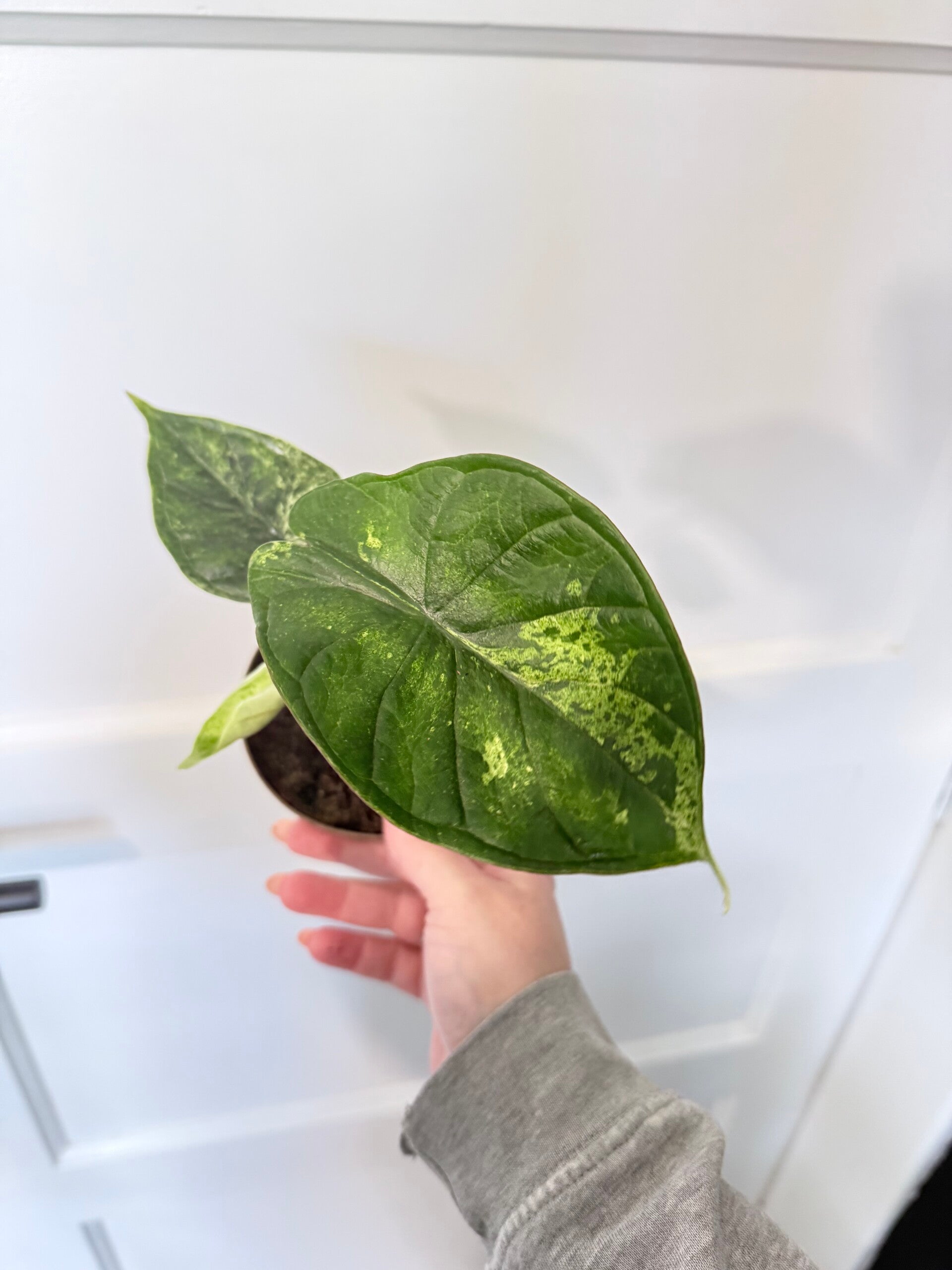 De Alocasia Dragon Scale mint is een betoverende variant van de geliefde Dragon Scale. Zijn donkergroene, glanzende bladeren met een uitgesproken nervenpatroon worden verrijkt door opvallende wit- tot geelgroene variegatie, waardoor hij nog mystieker oogt.