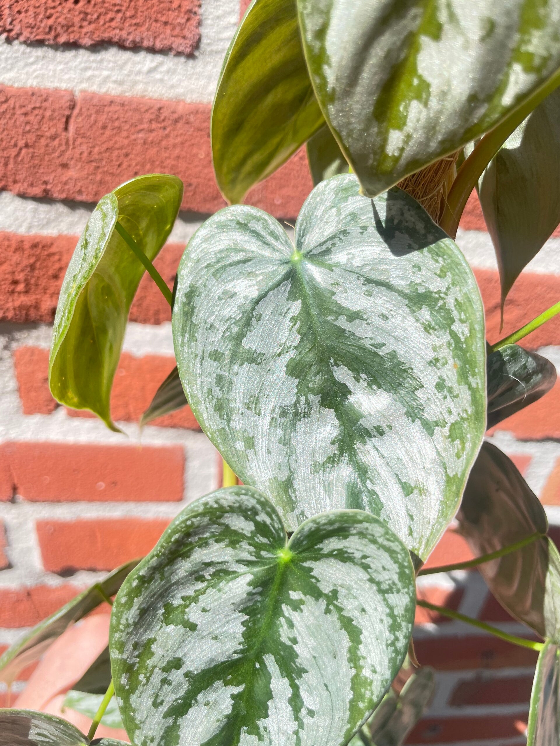 De Philodendron Brandtianum is een verfijnde en stijlvolle plant die opvalt door zijn unieke bladtekening. De hartvormige bladeren hebben een olijfgroene basis met zilverachtige vlekken die lijken alsof ze met de hand zijn aangebracht. Het geeft de plant een zachte, bijna artistieke uitstraling die moeiteloos in elk interieur past.